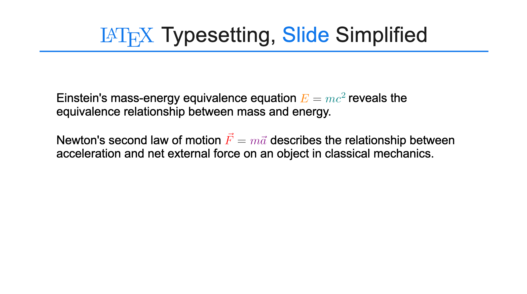 Newton's second law of motion \(\textcolor{red}{\vec{F}} = \textcolor{violet}{m\vec{a}}\) describes the relationship between acceleration and net external force on an object in classical mechanics.Rendered Result